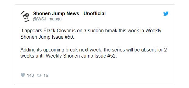 Leaker Black Clover terkmuka, @diab_26, menyatakan bahwa seri ini akan melakukan break mendadak minggu ini. Karena itu, Weekly Shonen Jump, majalah kepunyaan Shueisha sebagai tempat terbit seri ini akan merilis permintaan maaf mangaka, Yuki Tabata.