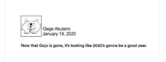 “Sekarang Gojo sudah tak muncul lagi (dalam storyline Jujutsu Kaisen), ku harap tahun 2020 jadi tahun yang baik”