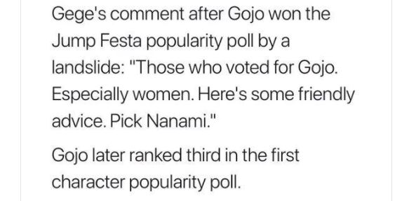 “Untuk siapapun yang memilih Gojo (sebagai karakter favorit), khususnya perempuan, berikut saran baik dariku: pilih saja Nanami.”